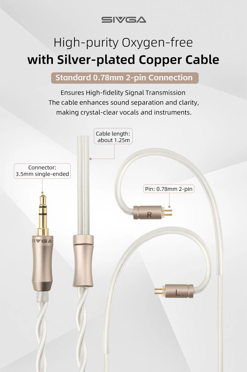 SIVGA Replacement Original 0.78mm 2-pin High-purity Oxygen-free with Silver-plated Copper Audio Earphone Cable for Que
